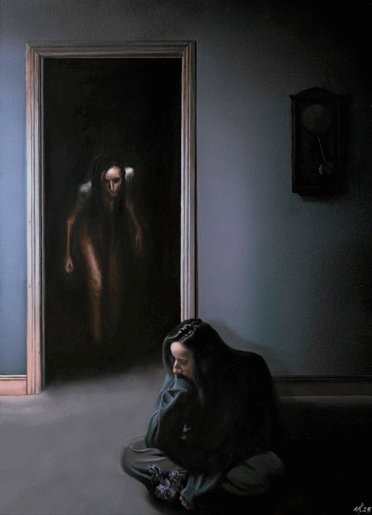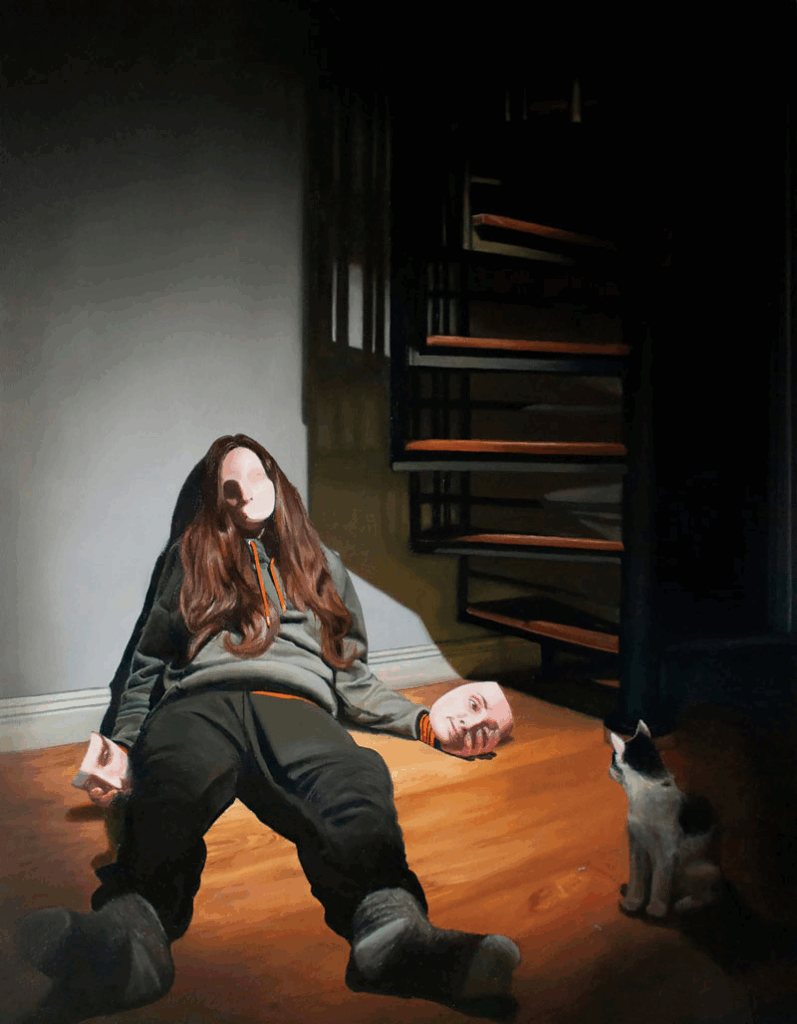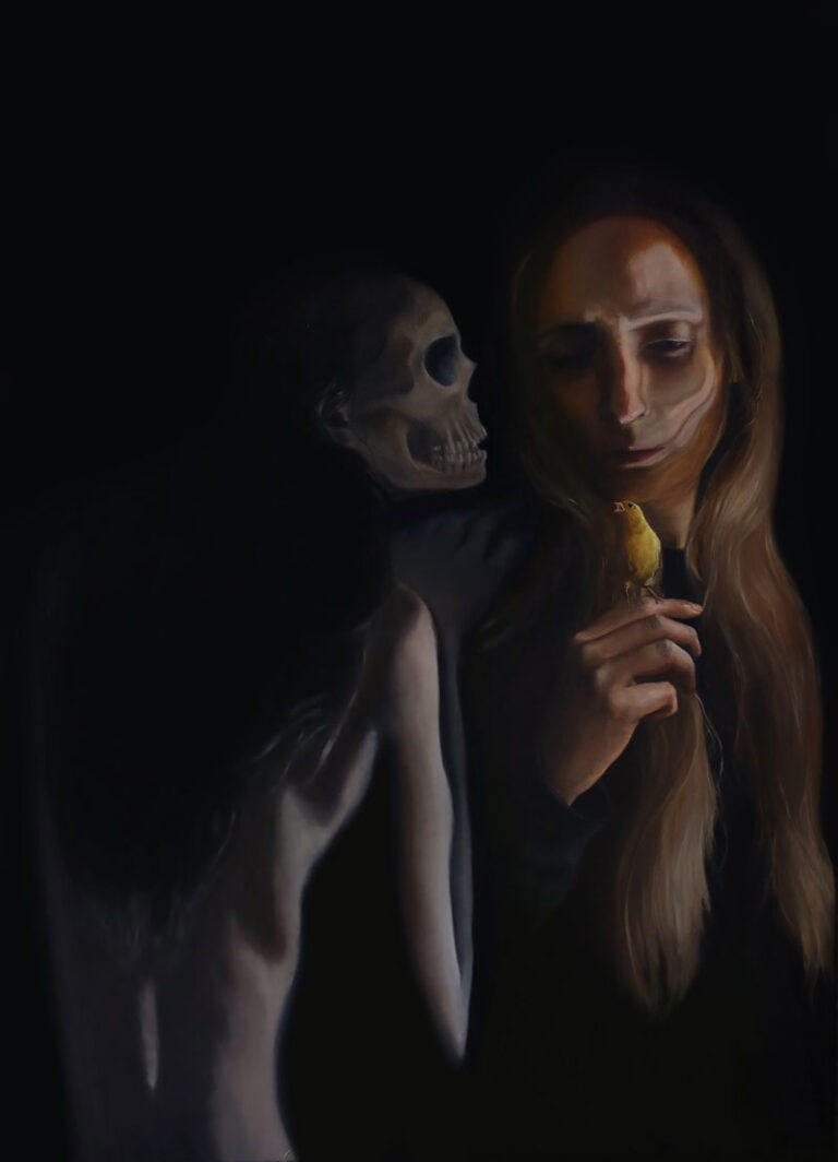 Hardy has truly become a master of her craft, as well as a master of learning how to adapt in a crisis. After Hardy lost her job during the pandemic, she started experimenting with another new medium, special-effects makeup, an experiment that ended up illuminating new understandings of her art. Regarding this time in her life, she shared, “[During the pandemic] I lost my job and turned to special-effects makeup as a distraction. It was less serious so I was less precious about the outcome. It was purely a creative and experimental outlet. Because I was applying SFX makeup daily, I found that I was always studying my face. This unexpectedly helped me further develop my skills in portraiture. When you’re engaging so much with your own face you begin to look at form and anatomy. It gave me an understanding of the facial structure and how our features engage with light. This prompted me to buy books, watch videos, and study other artists to actively improve my painting. When I finally moved away from SFX makeup I took all of that information to the canvas.”