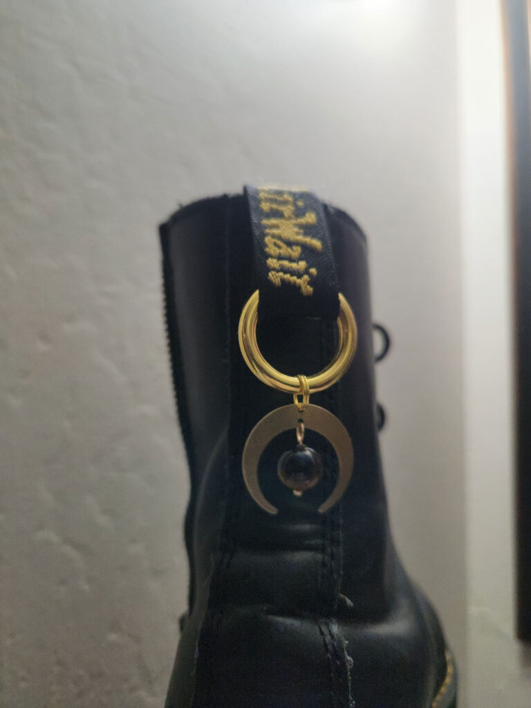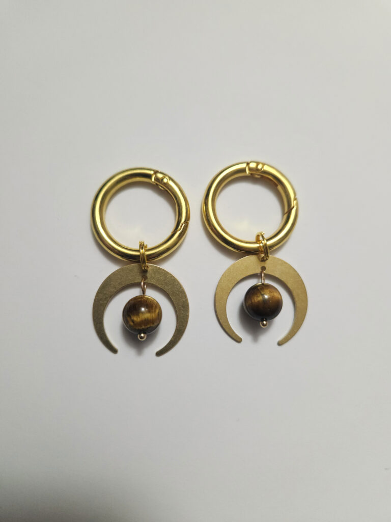 Pair of Gold Crescent Moon with Tiger’s Eye Boot Charms, $18, MagpieMystics.etsy.com