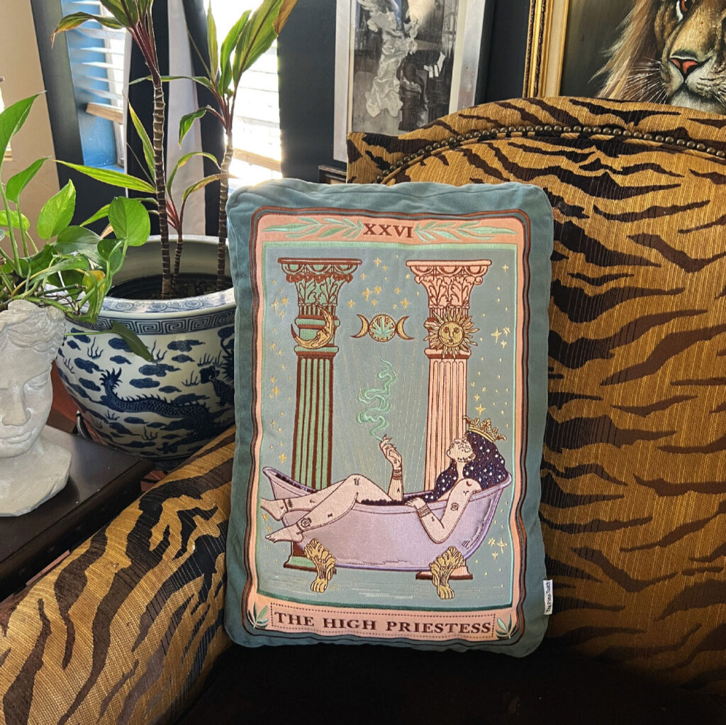 For that high priestess in your life who live, laugh, lounges with a joint in the bath, you have to get them this oversized embroidery pillow that depicts a total babe toking in the tub.