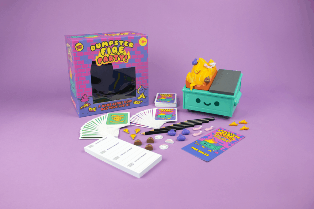 The game where you compete to see who’s life is the biggest dumpster fire: it comes with a toy dumpster to keep the pieces in and prompt cards asking players to tell their most trash stories about bad roommates, horrible first impressions, being broke, and then the most insane stories receive award cards. It also comes with magnetic trash charms like little bags of poop. This is the gift for your friend with the most insane tales.