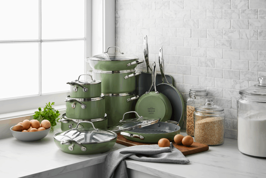 Valencia Pro Ceramic Nonstick 19-Piece Cookware Set | Sage, $599.99 for 19 pieces, greenpan.com