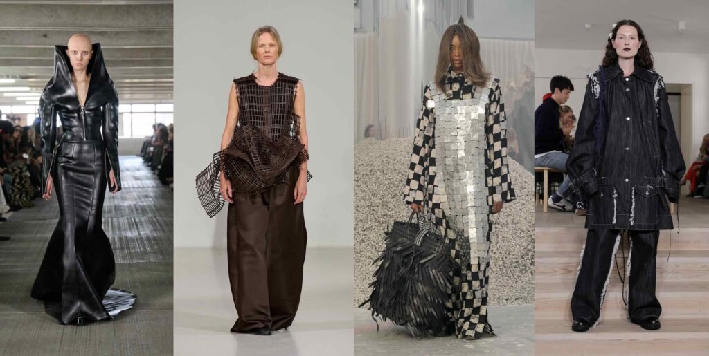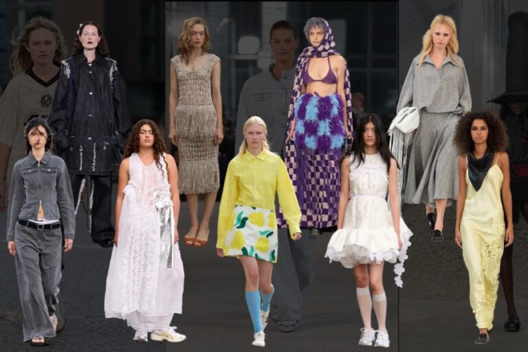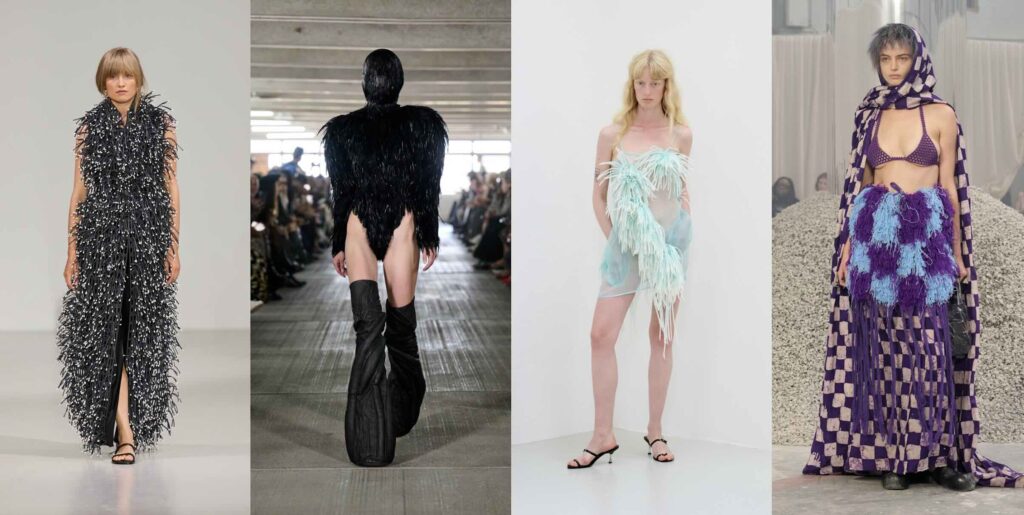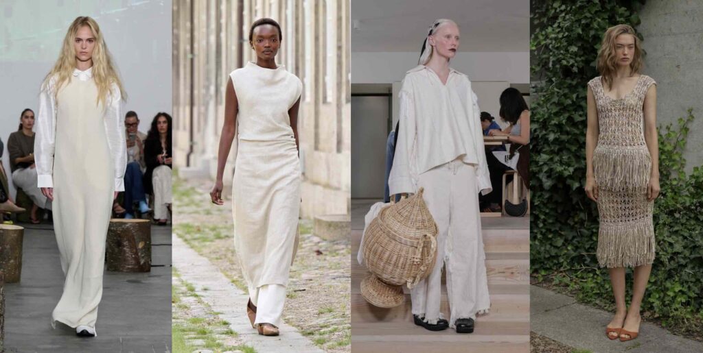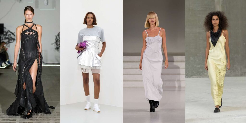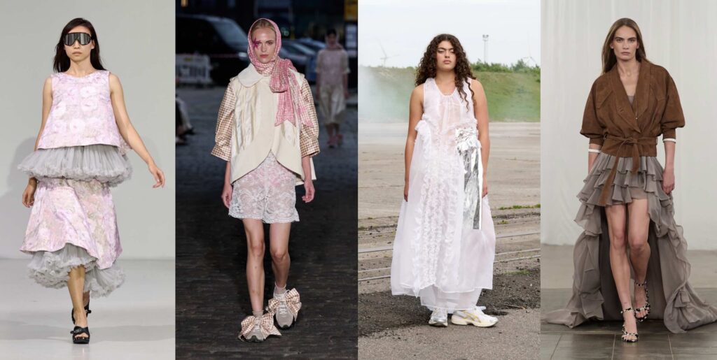 One of the most interesting trends on the list shows a nostalgia that feels surprisingly new to our generation. Not nostalgia for the opulent or bohemian style of the 70s, but a nostalgia rooted in our emotional attachment to our own old clothes, the treasures we find at second-hand stores, or pieces we gifted to younger cousins. Vintage bohemian is grounded in DIY culture where we don’t aspire to perfection anymore. Many pieces look as if they were just sewn together, layered in ways we hadn’t thought of before. Here, more power goes to the styling than the garments themselves, as the trend manifests in mixing and matching, balancing light and heavy, and combining different patterns. Designers are giving a nod to the vintage finds we’ve all accumulated over the years, especially since thrifting became so popular. Cecilie Bahnsen creates a ruffled white dress and disrupts the innocent look with silver inserts, styling it with Asics sneakers for a contrasting look. Meanwhile, Rotate offers a chic option with a skirt tail sweeping the floor, paired with a brown, 80s-inspired chunky jacket that looks like it belonged to a mom when she was a student.