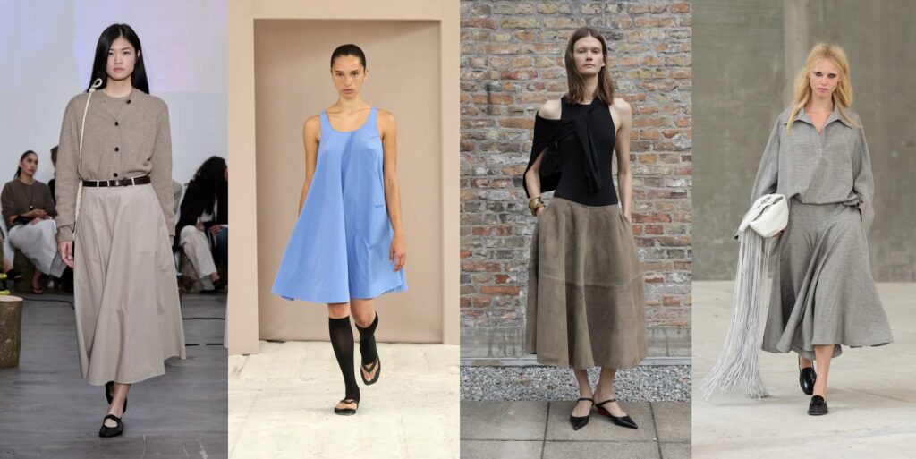 We (involuntarily) get up early, hop on a bike or run to the bus, go to work, pick up lunch, plan an unexpected walk with matcha and after work, squeeze in a gossip session at the bar. Just like that, we’ve spent a full 14 hours outside our house and needless to say, most of us don’t compromise comfort for the sake of a flattering silhouette. Flare might be that specific kind of cut for our busy schedules – allowing free movement while easily transforming into something dressy. Baum und Pferdgarten takes a romantic, flowy flare and pairs it with a structured suede jacket, giving it a particularly contemporary look. Aiayu, meanwhile, envisions a safari-style, neutral sand-colored bell-shaped skirt that is both flattering and comfortable (let’s celebrate pockets in women’s clothing!). Other designers also have shorts and trousers on the agenda. Seems like there will be no tucking into boots this season.