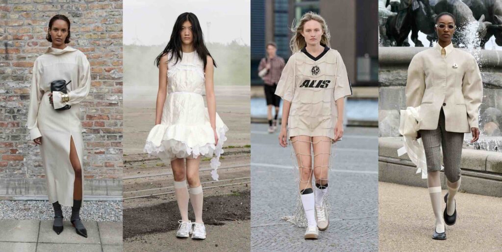 Not a new trend, but this season it feels simplified. We’ve left behind dressy lace ankle socks and bright, patterned knee socks, and instead are embracing the humblest of them all – transparent nylon knee socks. Most designers choose neutral colors like black, white, or nude. Of course, there are more opaque versions, but still none are overly decorative. Filippa K picked dark grey ribbed socks that everyone’s dad probably had at some point, letting them slouch around the ankle. These socks are paired with elegant black heels and a silk long skirt with a side slit, turning a humble accessory into an elevated cocktail look. Cecilie Bahnsen, meanwhile, chose thin, transparent white knee socks that somehow give a badass vibe to a dolly-puffy silhouette. It’s good news for those who tend to get blisters from less-than-comfy high heels.