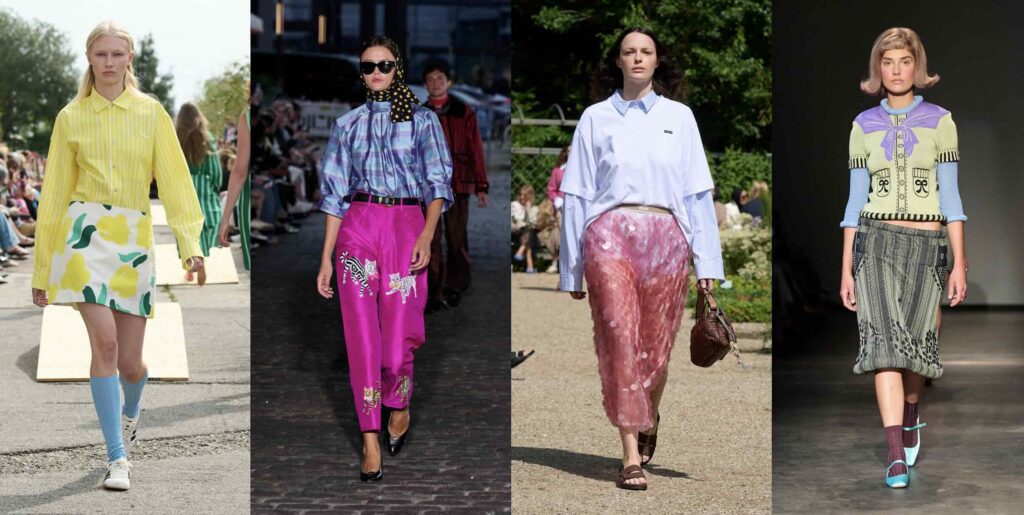Meme culture and brain rot are terms so specific to our digital era as we are constantly online. In uncertain times, designers show a desire to escape the gloom using humor and kitsch unapologetically. Here, the more chaotic, the better. The outfits on the runway are as overstimulating as our social media feeds. After quiet luxury, it seems fashion is embracing loud styles again. There is no such thing as too much, and no two colors that don’t match. We see a revival of witty phrases on t-shirts and absurd-but-silly patterns, like cats with ribbons in their mouths on neon fuchsia taffeta pants in Caro Editions’ collection. Marimekko offers a slightly toned-down version (if we can even call it that), suggesting a striped yellow masculine button-up shirt paired with a fruit-patterned skirt and striking blue socks. For some, this might feel like never-ending optimism; for others, it’s a way to criticize the state we all find ourselves in.