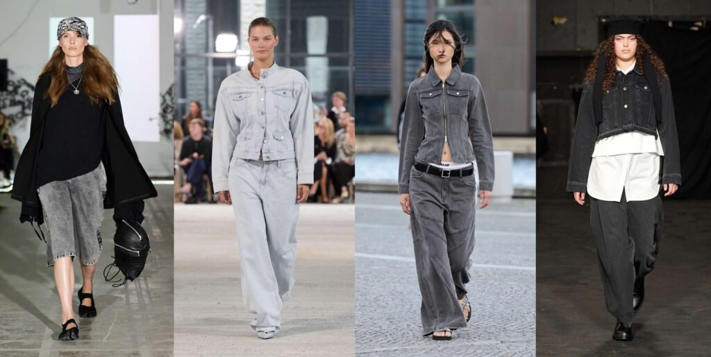 Denim never goes out of style. Do you remember a time when jeans were truly outdated? Maybe a specific cut, yes, but jeans themselves – never. This season, it’s more about denim than jeans (the fabric versus the garment made from it). Since its invention, we’ve been experimenting with what’s possible with denim, and this season we’re circling back to stonewashed looks. Maybe it’s tied to the worn, faded aesthetic that’s everywhere right now– the broken-in vibe feels just right. Washed denim this season comes in all shapes and forms, everything from evening dresses to your classic jean jacket. Fine Chaos created a contemporary, street-style look with strong acid-wash jorts (long jean shorts) paired with an oversized top, giving a baggy, extremely comfortable overall effect. Gestuz, on the other hand, suggests a softer, very light blue matching two-piece set of jeans and jacket, worn with high heels to give it an elegant touch. Stonewashed, acid-washed, baggy or sleek – denim always gets us.