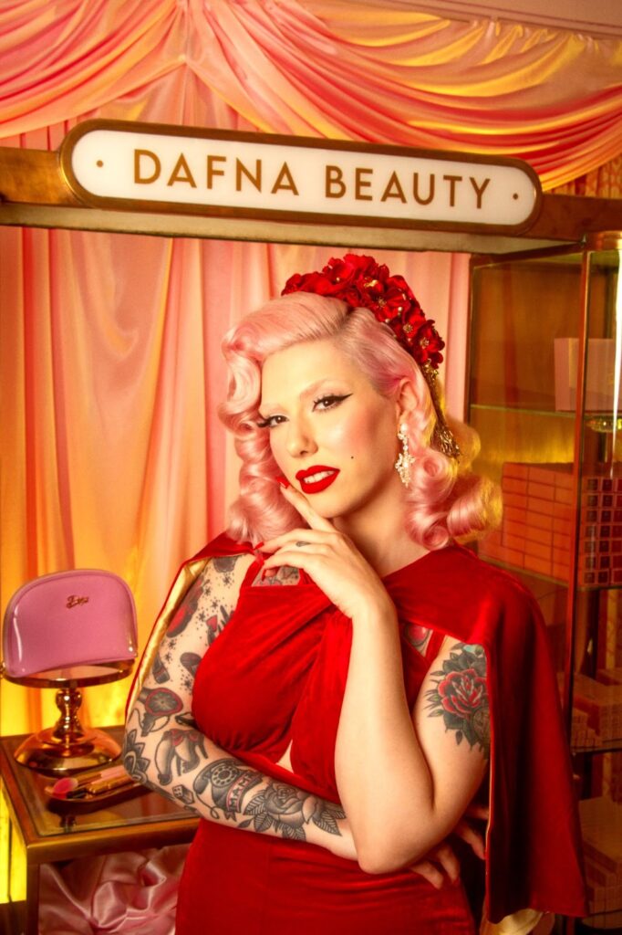 Pinup model and makeup mogul, Dafna Bar’el (@Dafna_Barel), is the founder of Dafna Beauty, a vintage-inspired vegan cosmetics brand bringing Old Hollywood glamour back to the modern makeup bag. Known for her signature pink-on-pink palette and ultra-femme aesthetic, she reimagines the iconic silver screen starlet in striking colors and irreverent charm.