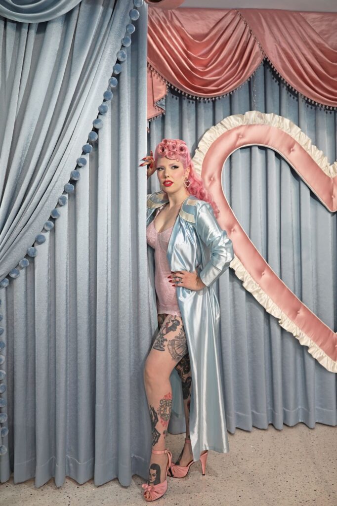 Often sweeping her rose-quartz-colored hair into a playful poodle updo, she balances the sweetness with crimson lips and cat eyes sharpened to dagger-like precision. Her cruelty-free wardrobe shimmers with technicolor vibrance, from pastel velveteens to crystal gloves, faux furs, and bold animal prints.