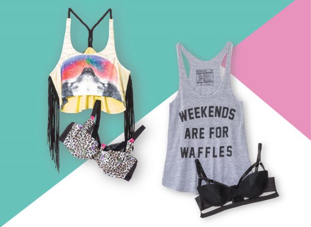 Weekends Are For Waffles Tank, $28, pyknic.com; Elastic Straps Demi Bra, $25.88, blackheartlingerie.com