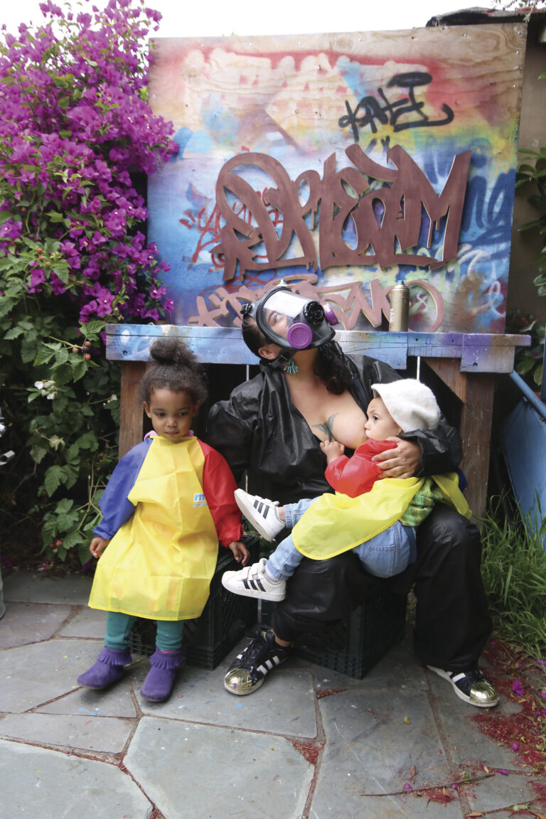Main Image: Agana in between painting and breast feeding with her children with a Mike “Dream” Franscisco TDK cutout behind her she made to honor the legacy of the leader of the TDK crew, Dream who was murdered during a robbery in West Oakland on Feb. 17th 2000 and was one of the first graffiti writers to put political messages in his pieces.