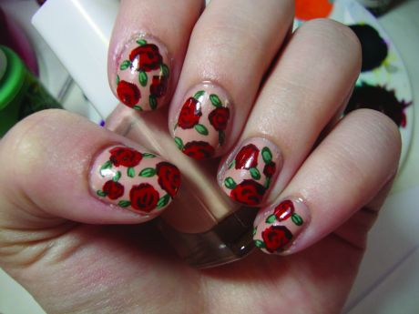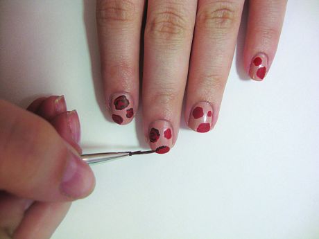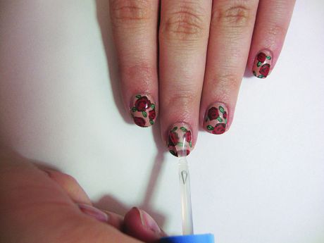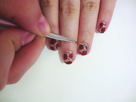 Using a thinner brush and a dark red nail polish, carefully outline each rose, then do several smaller C-shapes within the circle to suggest petals.