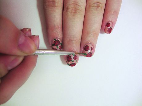 Using the same thin brush and a dark green nail polish, lay the brush down on your nail to make ovalshaped leaves around each rose.
