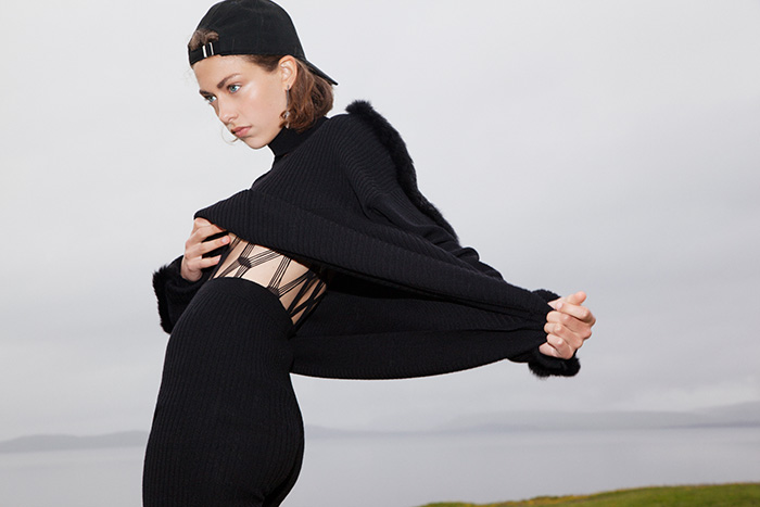 SIGGA MAIJA SWEATER WITH FUR TRIM, KNITTED PANTS, AND HILDUR YEOMAN CRYSTAL EARRING, KIOSKREYKJAVIK.COM; ADIDAS ORIGINALS CLASSIC CAP; FALKE BODY SUIT.