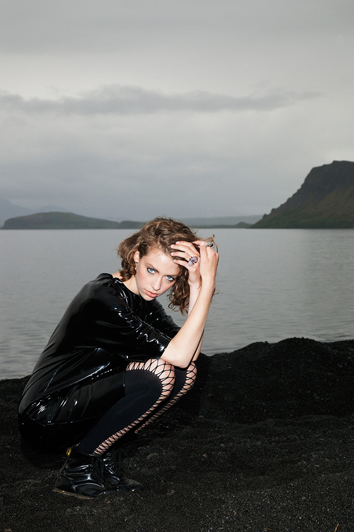 SIGGA MAIJA VINYL DRESS; HILDUR YEOMAN CRYSTAL EARRING AND RINGS; FALKE TIGHTS; DR. MARTENS BOOTS.