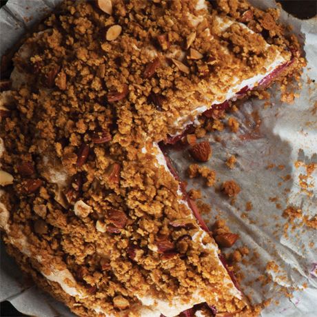 - In a clean metal bowl, whisk the egg whites till they’re thick and frothy, then slowly add the sugar while whisking continuously—until the mixture’s shiny and bright white. Carefully spread this across the top of the plums in the pie tin. Roughly chop the almonds and mix them into the remaining crumble, scatter this on top of the meringue.