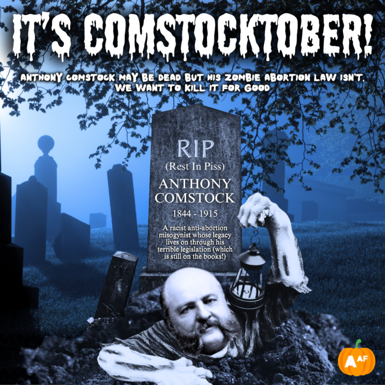 With just a few days left in September, we at Abortion Access Front are counting down to Comstocktober! With the spooky season upon us, we want to slay the Comstock Act’s zombie ass once and for all, then celebrate with ALL the caramel apple flavors (SUCK IT, pumpkin spice)!