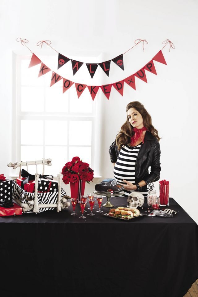 Instead of traditional (boring) shower games, try karaoke with music that goes along with your theme. At our Cry-Baby shower, we’d also have cool activities like a tear-drop station where people can use glitter or black eyeliner to draw little tears under their eyes; a temporary-tattoo station; a flash-art board that guests can use as inspiration for decorating blank onesies with flames or switchblades; and a mug-shot photo booth where guests can hold up a license plate that ?says “Congrats!”