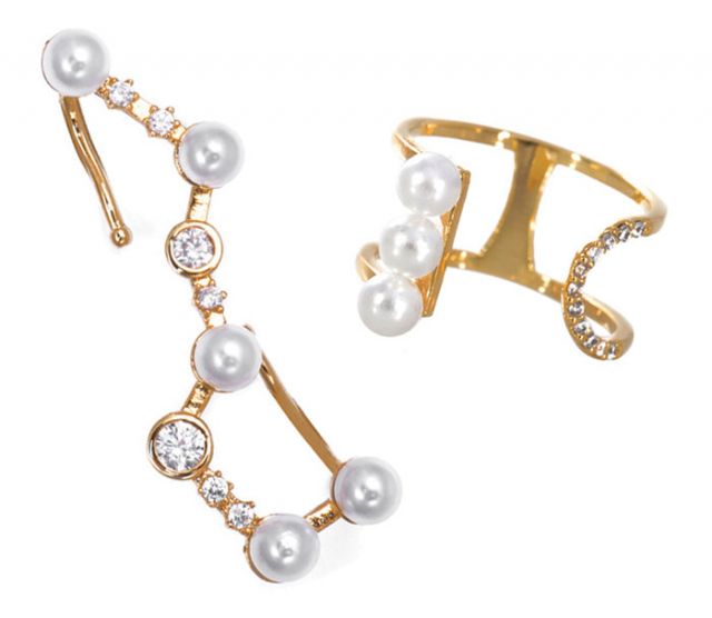 2. Constellation Pearl Gold Ear Cuff, $49; Crystal Wrap-Around Pearl Gold Ring, $35