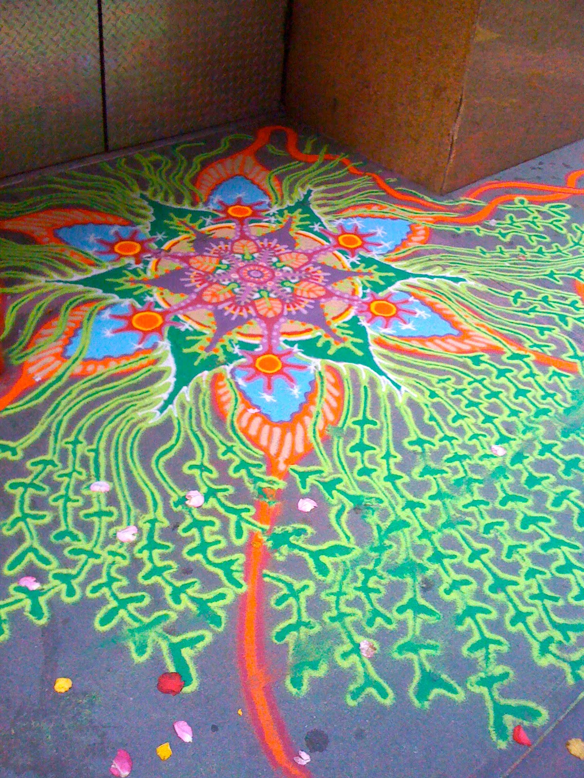 As we approached the relatively nondescript office building the studio’s in, we found the stunning sand art creation by Joe Mangrum pictured above , radiant colors lighting up the concrete and gritty metal doors, pink, yellow and rich red rose petals strewn in front of the doorway, more petals creating a path down the hall, into the elevator and towards the studio front door. Inside the reception area was packed with people in sundresses, or yoga gear, the larger studio itself had dozens of yoga blankets neatly placed in a semi-circle, ropes of multi-colored lights wrapped around the instruments and chairs where the musicians would be.