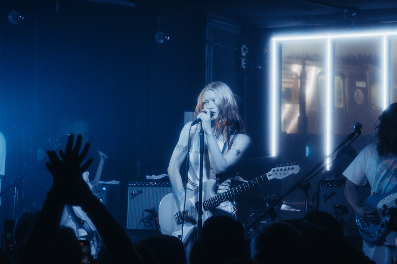 Parting the sea of fans, the band, led by Rhian Teasdale and followed close behind by Hester Chambers, walk toward the platform and through the crowd, guitars in tow. Teasdale is wearing a 666 tank top and boxer briefs that say Holy Spirit. Her hair is a rose gold blush hue. She sizes up the room as she stands in a muscle pose. Her fierce onstage presence is vastly different from the meek-looking brunette who, along with band cofounder Hester, brought us the cheeky, electric-guitar driven, intoxicating debut single “Chaise Lounge” back in 2021. The two of them used to stand in parallel onstage, but —Chambers seems to have taken a few steps backward, letting Teasdale take the reins, and she’s radiating formidable front woman energy. But no time to dissect the new setup and staggering look—the gritty guitars and crashing percussion of “catch these fists” have begun, and they’re loud enough to drown out the train that passes behind the stage during the set. “Can you catch a medicine ball?” Teasdale asks with deadpan delivery, making eyes with the congregation beneath her. By the time the words “Cause what I really wanna know is can you catch these fists?” leave her lips and hit our ears, we’re won over, and when the swelling refrain rushes in on the back of ricocheting bass parts, right before a blistering chorus pulls us in, BUST is giddy, swinging our hair to dance-punk so pure, so frenetic, it’s clear the chart-topping band are on to another winner.