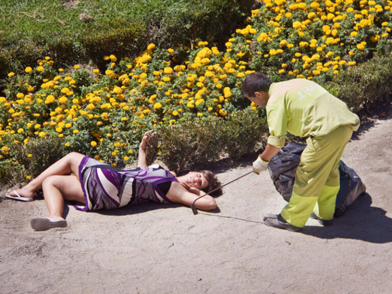 Poses depicts real women in real-life situations imitating some of the contortionist poses found in fashion magazine editorials, and both hilarity and discomfort ensues. The series is a direct criticism of the objectification of women in advertisements as well as commentary on the fact that highly-distorted images of women fail to represent those who don’t fit within a restricted physical mold. While some of these odd poses don’t seem harmful in and of themselves, because fashion and advertisements ultimately make up such a large part of feminine representation in the mass media, they can be extremely influential on the thoughts and behaviors of both men and women.