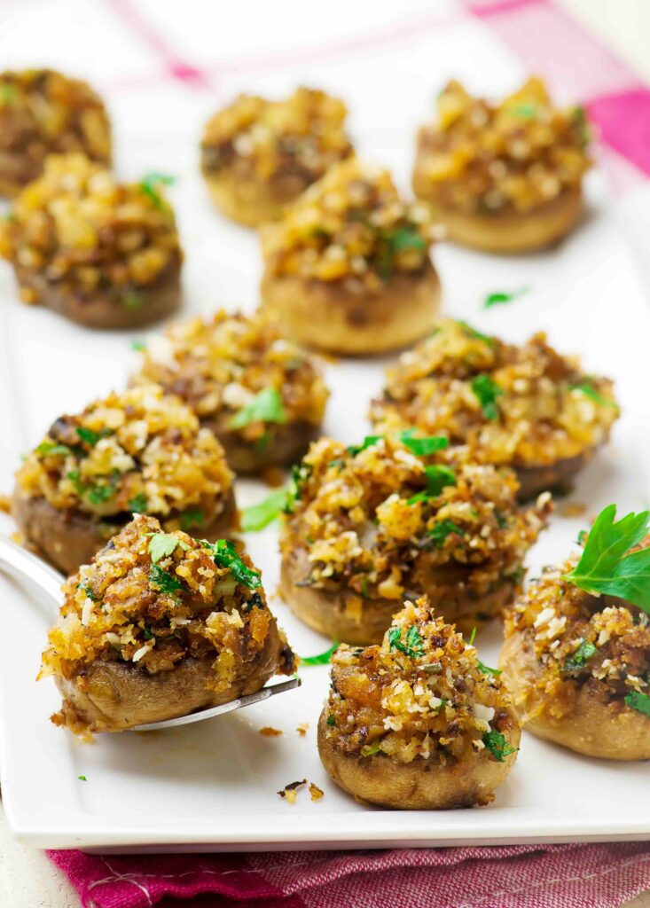 Place mushroom caps, round side down, on the parchment paper, and gently fill with a scoop of the stuffing mixture. Bake in a preheated oven for about 10 minutes, until the mushrooms are softened and the stuffing mixture is lightly browned.