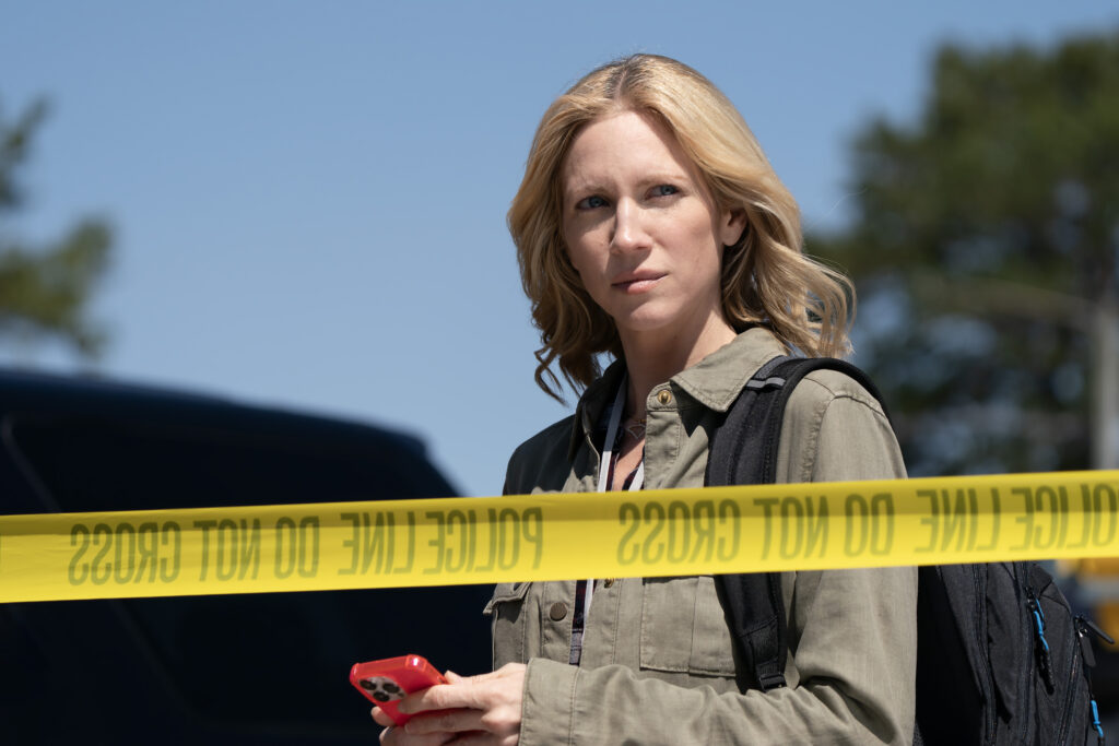 While Snow is a fan of the genre, it wasn’t just her love of true crime that drew her to taking on the project, she was also specifically drawn to portraying Mandy Matney herself. “I’ve never played a real person before, especially not someone who is alive and going to be on set as a producer. I knew the pressure that was going to create, but I was also open to that challenge because I wanted to do an homage to her, an interpretation of the essence of her, and not portray an imitation. In other words, Mandy being there was really interesting for me, because I needed to make sure that she felt connected to what I was doing, but also didn’t feel like I was trying to be her in any way.” Snow went on to describe the feeling of pride she felt to take on a story like Mandy’s. “Mandy as a person is so layered, and fascinating, and she’s such a feminist and a strong voice not only in her field, but also for women in general.” Snow went on to say, “That act of not wanting to let her down and tell her story in the best way that I could was a challenge I was open to, but also a little scared by. But usually when I’m scared, it means I should do it.”